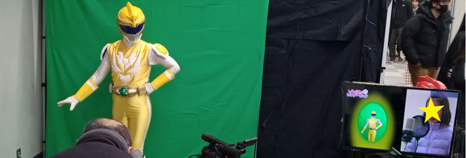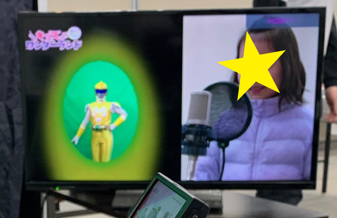 声優挑戦中のお子様とドラゴンマンの動きを同じ画面に合成表示